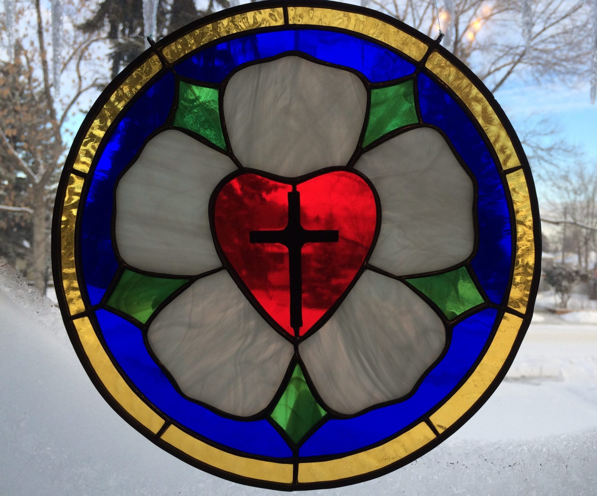The church seal was designed by Dr. Martin Luther while teaching at Wittenberg, and it has become the primary emblem of the Lutheran Church. Comprising it are: the black cross, for faith in Christ crucified; the red heart, for faith in the Savior; the white rose, to show that faith causes joy, consolation and peace; the blue sky, to denote that such joy of faith in the spirit is the beginning of heavenly joy to come; and the golden ring surrounding all, to signify that such bliss in heaven is endless.